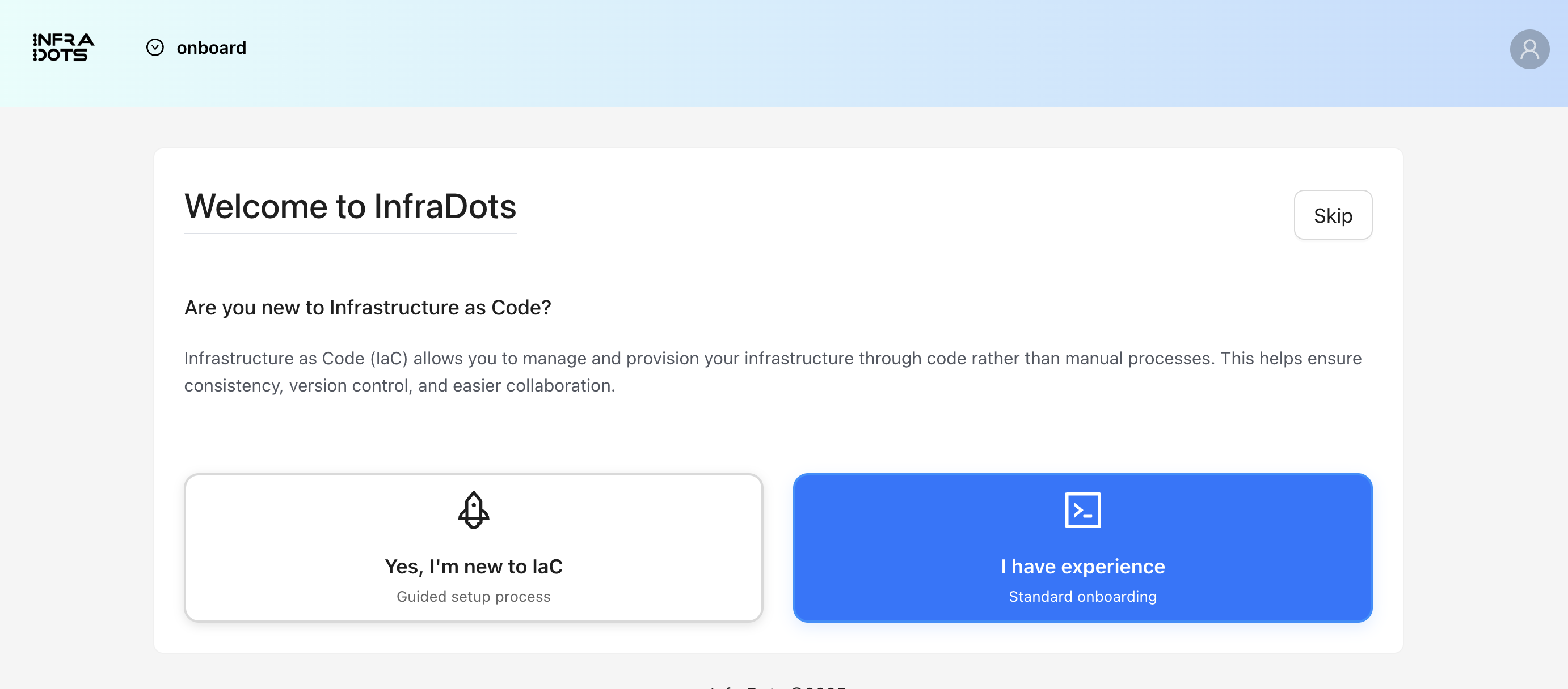 You're new to InfraDots and want to use the onboarding flow to get familiar with the platform and optionally provision infrastructure with AI or pre-built building blocks.