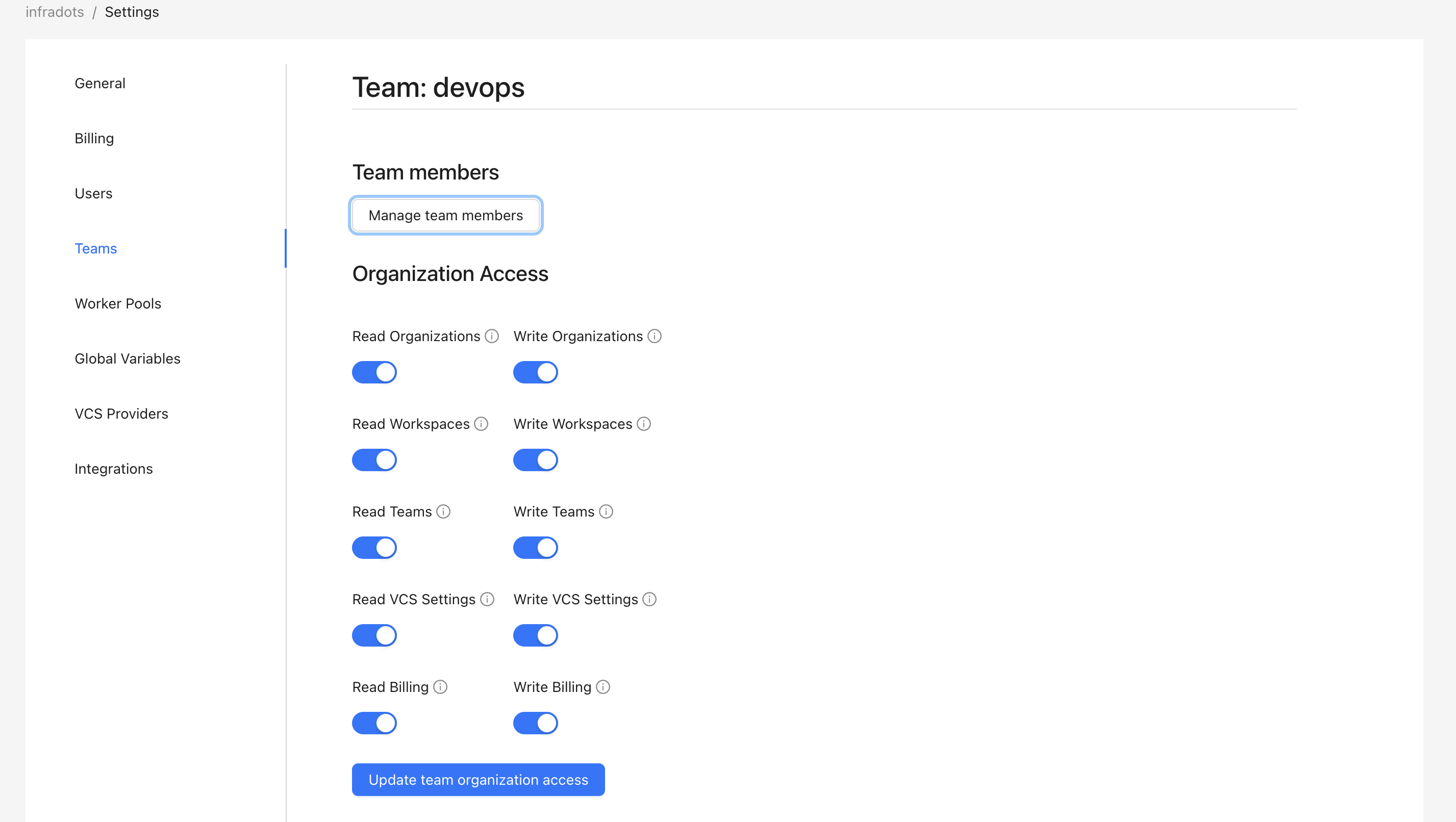 Team permissions are configured at a granular level per team, controlling access to organizations, workspaces, VCS settings, and billing.