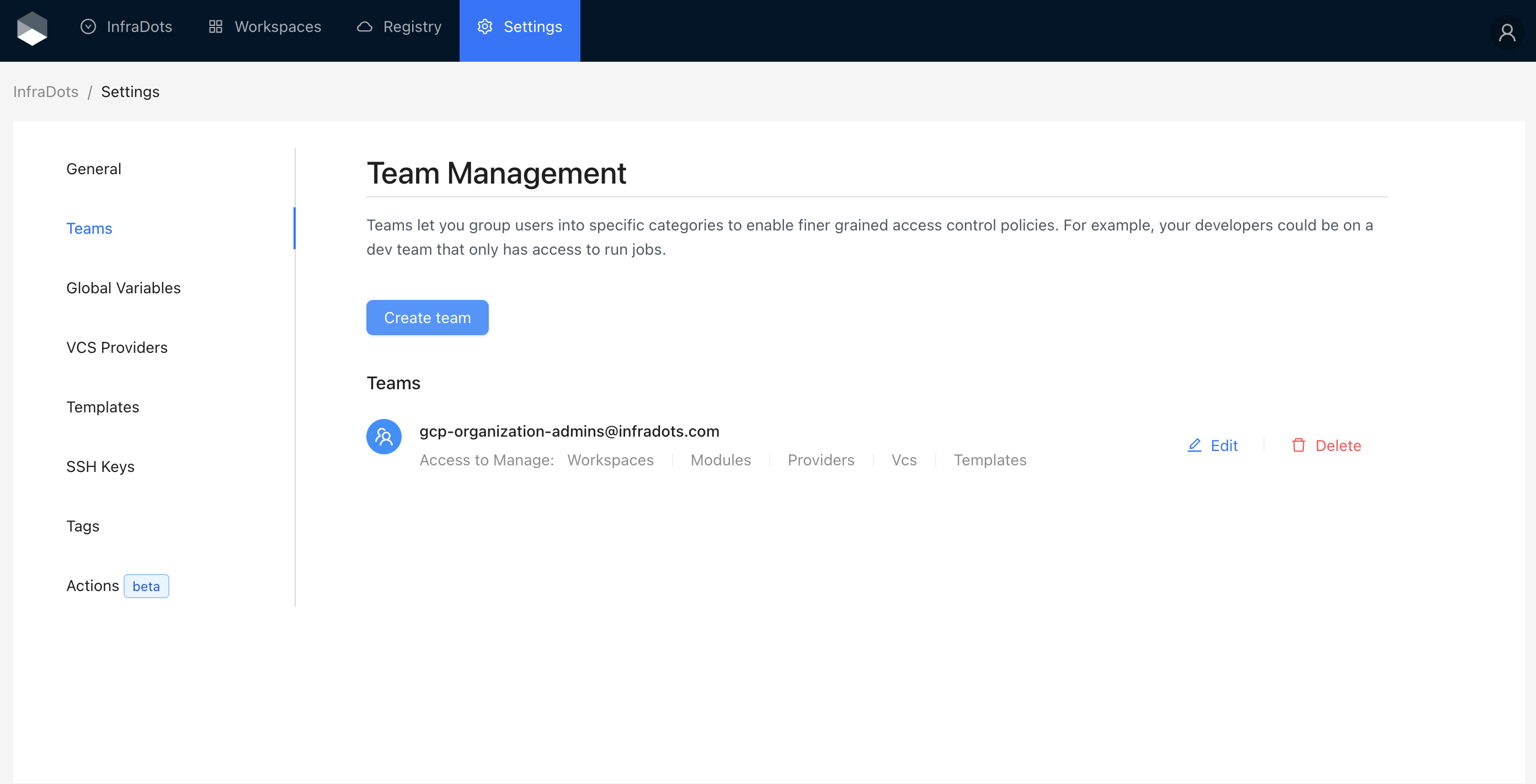 An organization in InfraDots Platform is the over arching structure that holds all your infrastructure code and components. Depending on the structure of your company and processes you may chose one of several routes: